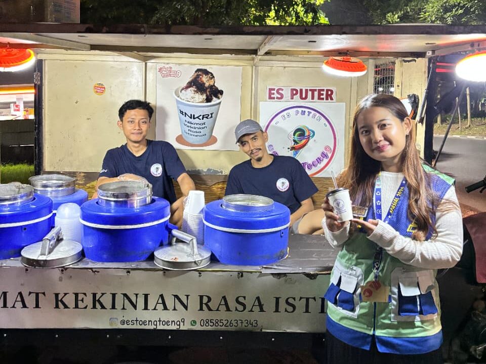Es Puter Toeng-Toeng yang lengkap dengan tagline legendarisnya, “Nikmat Kekinian Rasa Istimewa” hadir sejak 2019 pra-pandemi COVID-19, Es Toeng Toeng 9 yang berlokasi di Gebang Putih, Sukolilo, Surabaya konsisten menghadirkan cita rasa tradisional Indonesia yang kuat dengan sentuhan kekinan. Tidak seperti es krim pada umumnya yang berbahan dasar susu, Es Toeng Toeng 9 menggunakan santan sebagai bahan utama es krim yang dibuat. Santan kelapa sendiri digunakan oleh Masyarakat Indonesia sebagai pengganti susu sejak zaman kolonial Belanda lho teman-teman. Santan ini digunakan Masyarakat Indonesia sebagai pengganti susu, hal ini membuat es puter khas Indonesia ini memiliki kaya rasa, gurih, dan lembut. Es Toeng Toeng 9 mengembangkan es puter tradisional dengan bebagai varian rasa yang berbeda setiap harinya dan dengan pilihan toping seperti roti, susu, meses, hingga milo, membuat setiap kunjungan menjadi terasa unik. Sesuai dengan namanya, es puter dibuat dengan cara “diputer-puter” menggunakan tabung logam. Tabung logam yang akan “diputer-puter” ini akan diisi dengan adonan santan, gula, garam, vanili, dan maizena. Tabung yang telah diisni dengan adonan akan dimasukkan ke dalam wadah berisi es batu dan garam kasar lalu akan diputar selama 30 hingga 60 menit samtai adonan di dalam tabung logam membeku dan menjadi es krim. Fun fact, garam kasar yang digunakan berfungsi sebagai pengatur titik beku es batu menjadi lebih rendah agar proses pembekuannya lebih cepat dan merata. Eits tenang aja temen-temen, meskipun “diputer-puter” ga akan bikin pusing kok. Dengan proses tradisional unik inilah Es Toeng Toeng 9 menciptakan cita rasa nostalgia yang akan menghidupkan kembali kenangan manis tempo dulu yang bersanding dengan rasa segar kekinian.